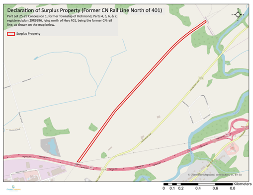 Part Lot 25-29 Concession 1, former Township of Richmond; Parts 4, 5, 6, & 7, registered plan 29R9996, lying north of Hwy 401, being the former CN rail line, as shown on the map below.